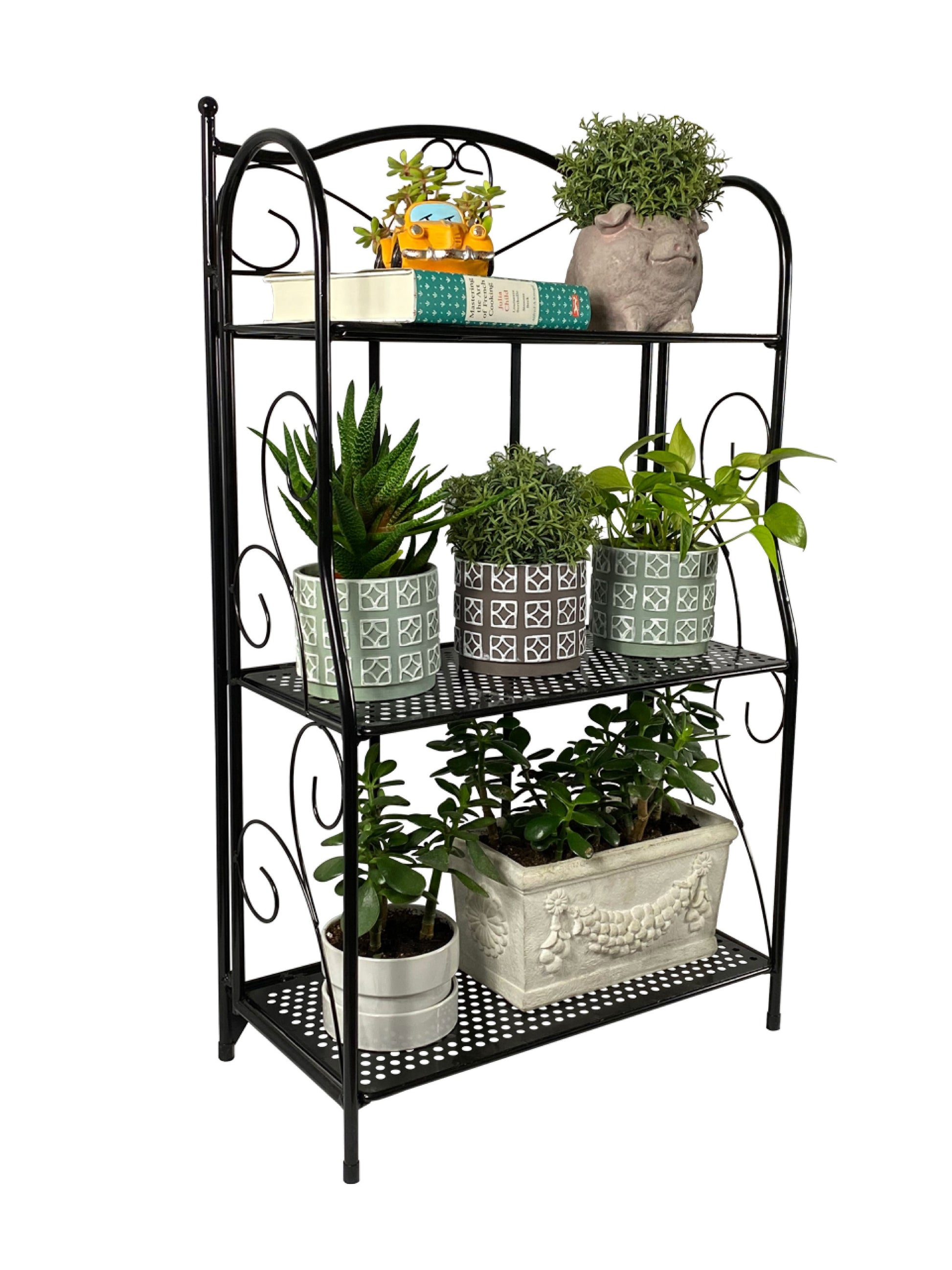 Versatile plant stand features three sturdy mesh shelves give you loads of options for a display. Each solid mesh shelf surface is well built and sturdy to hold everything from potted houseplants, flowers, books, candles, or any collectibles.