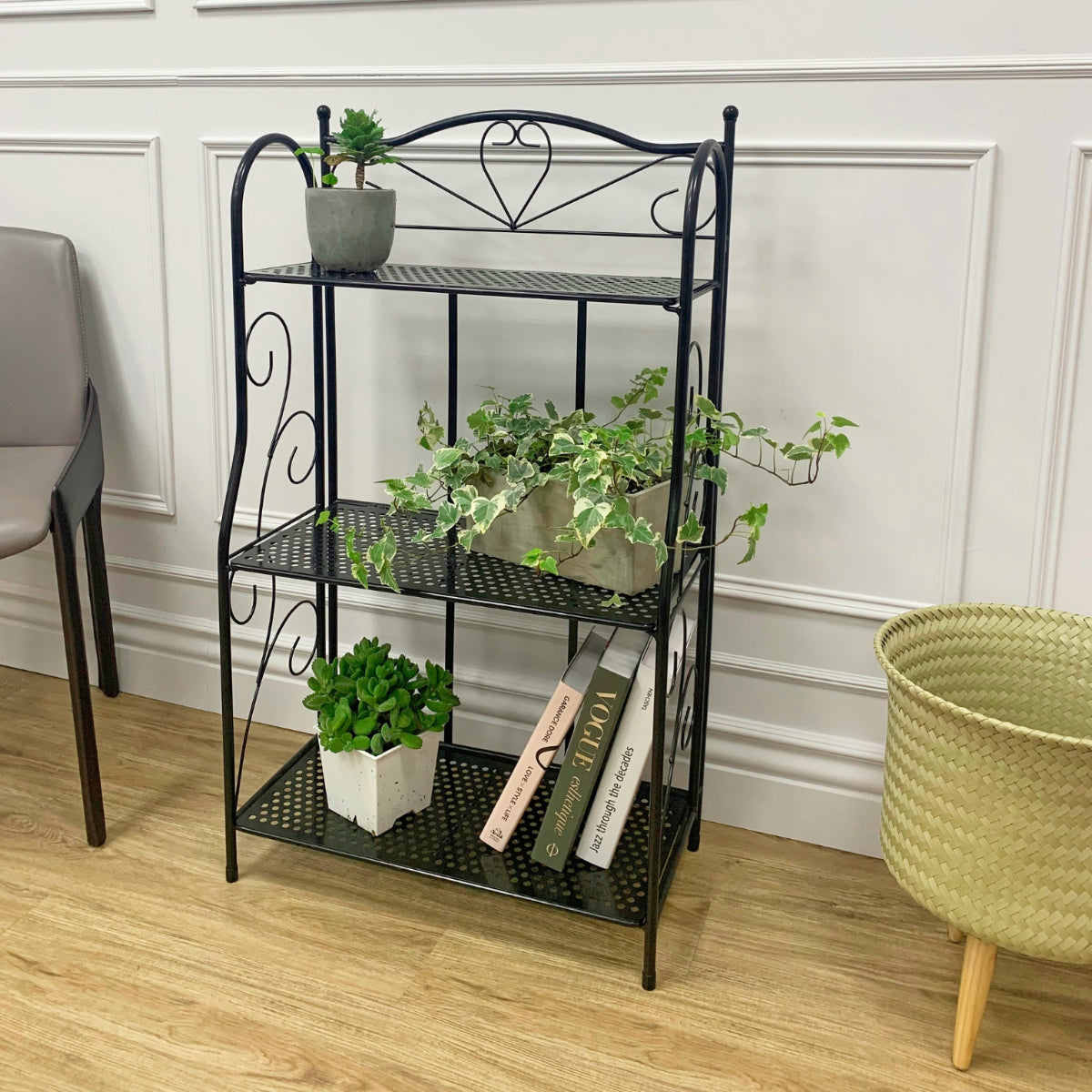 【HEAVY DUTY】 Three sturdy mesh shelves give you loads of options for a display. Each solid mesh shelf surface is well built and sturdy to hold everything from plants, books, candles, or any collectibles