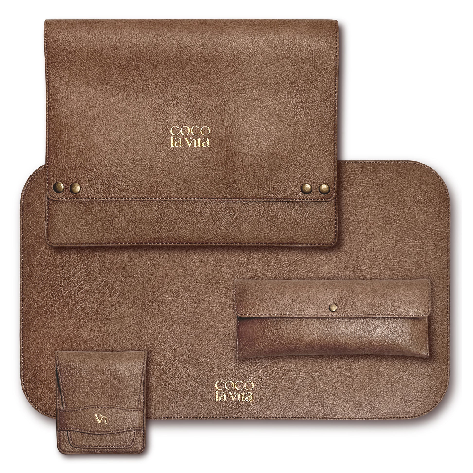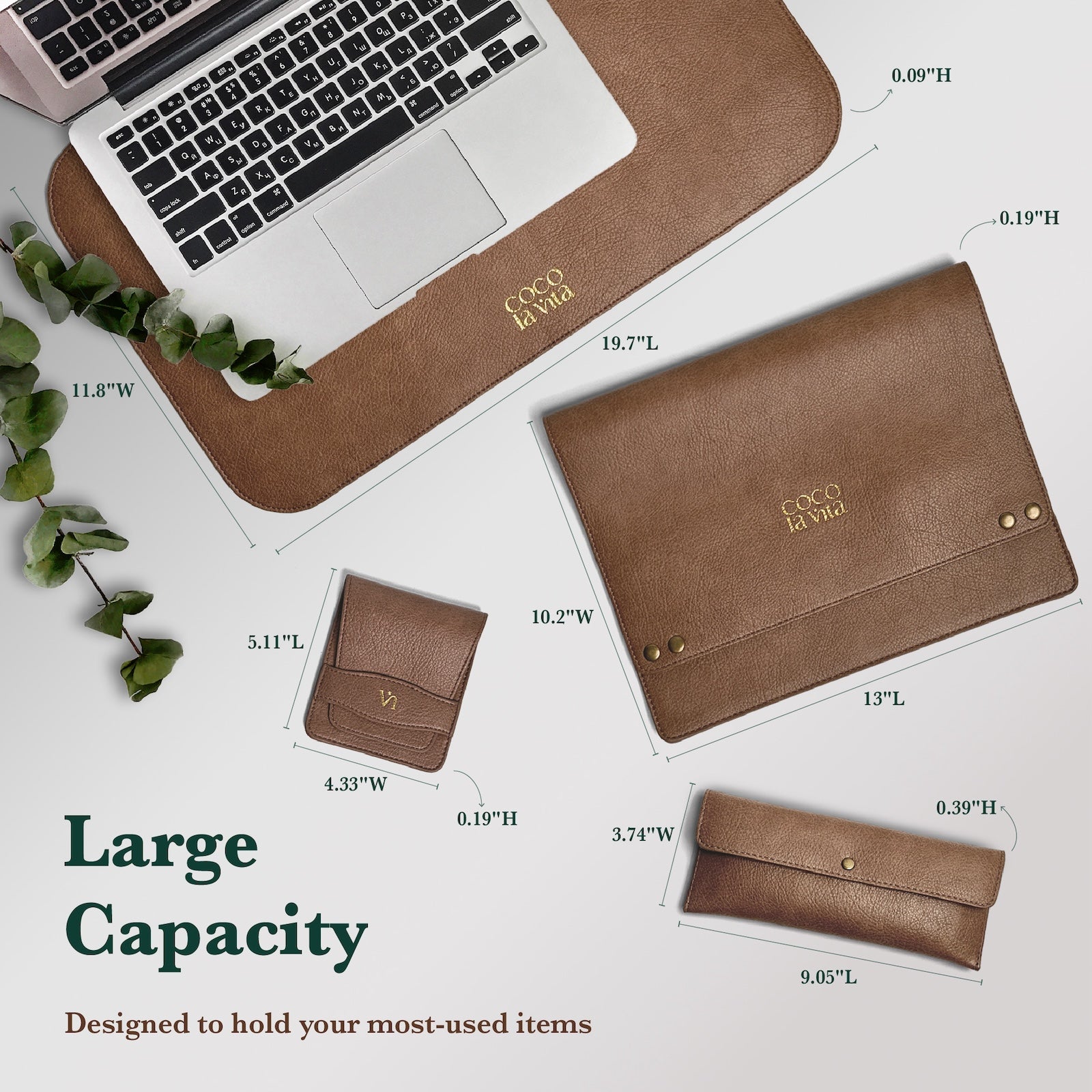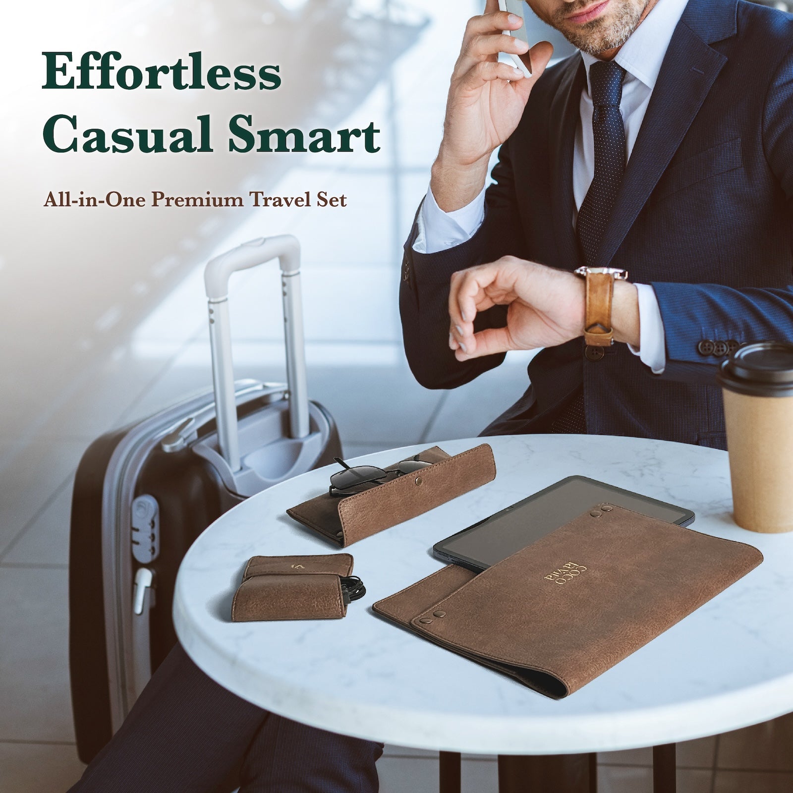 Complete Office & Travel Set: Includes a leather padfolio, desk mat, carry-on clutch, card pouch, and leather laptop sleeve, all designed to keep you organized.