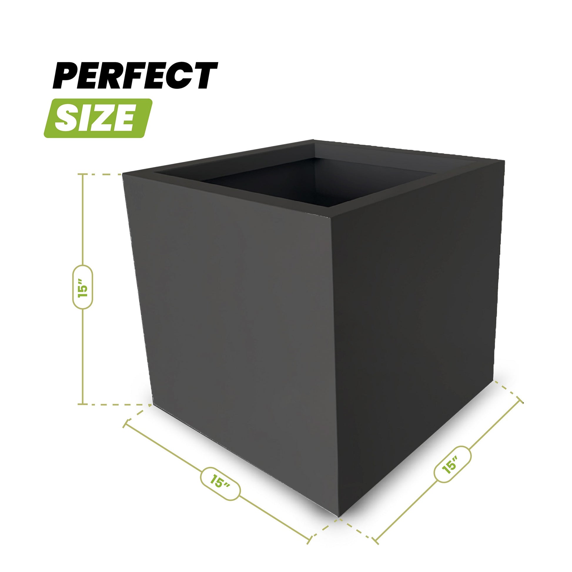 GREAT SIZE AND CONSTRUCTIONThis planter box is made of thick metal that looks ornamental and will pass the test of time. Our cube planter is the optimal solution for your outdoor décor or commercial décor.  The plant container measures approximately 15 in. L x 15 in. W x 15 in H.
