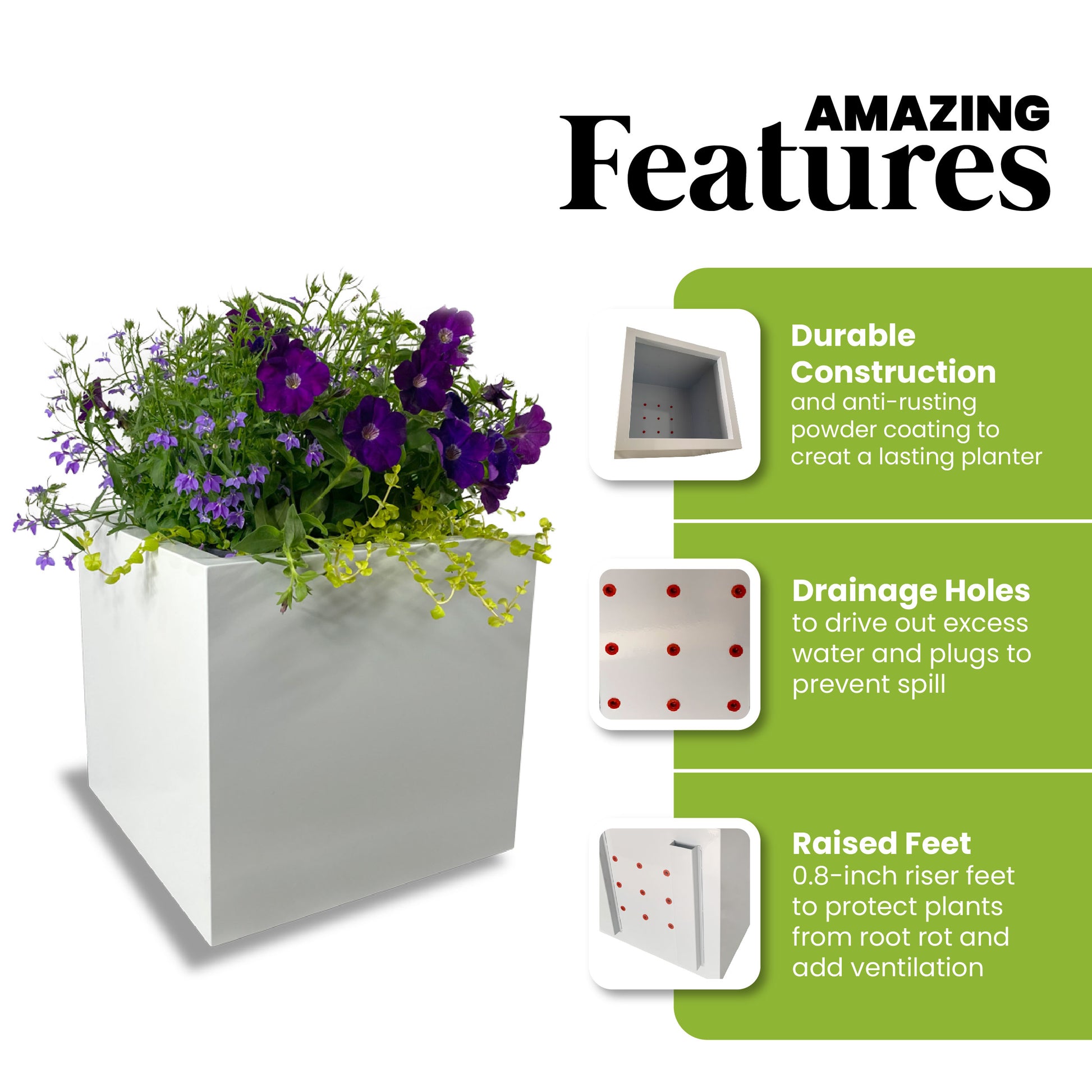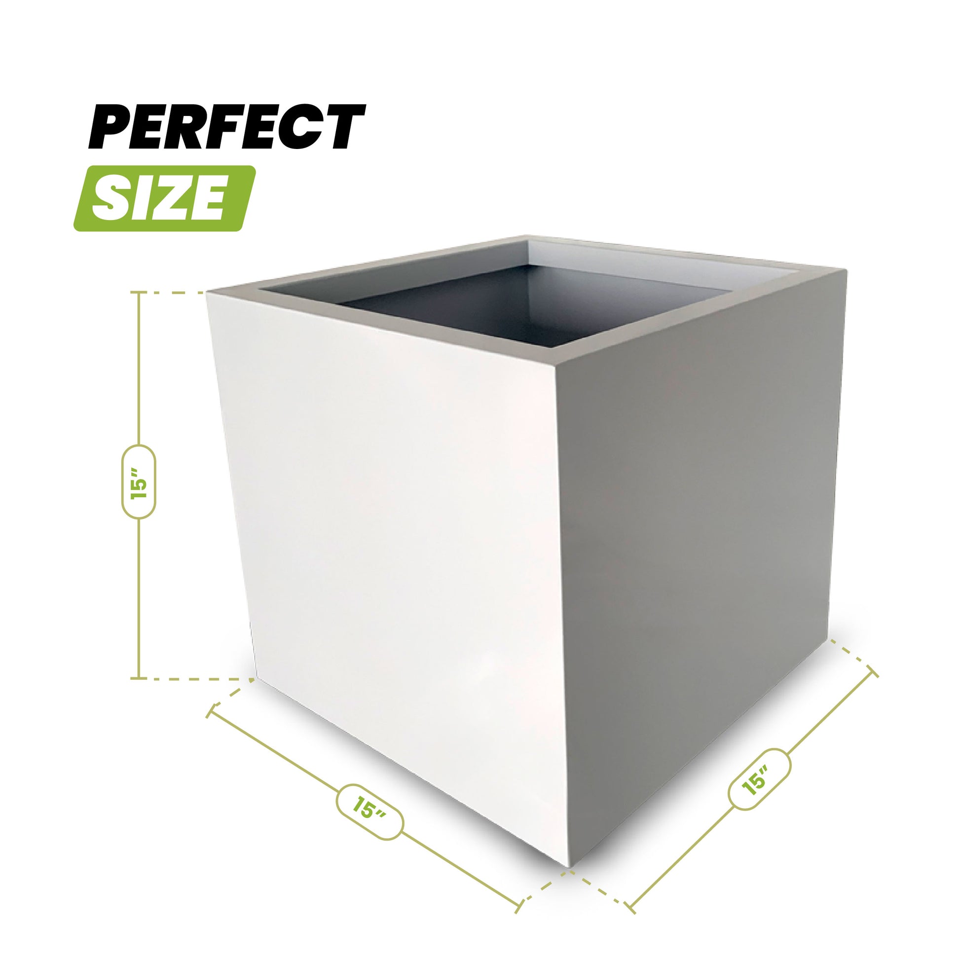 GREAT SIZE AND CONSTRUCTIONThis planter box is made of thick metal that looks ornamental and will pass the test of time. Our cube planter is the optimal solution for your outdoor décor or commercial décor.  The plant container measures approximately 15 in. L x 15 in. W x 15 in H.