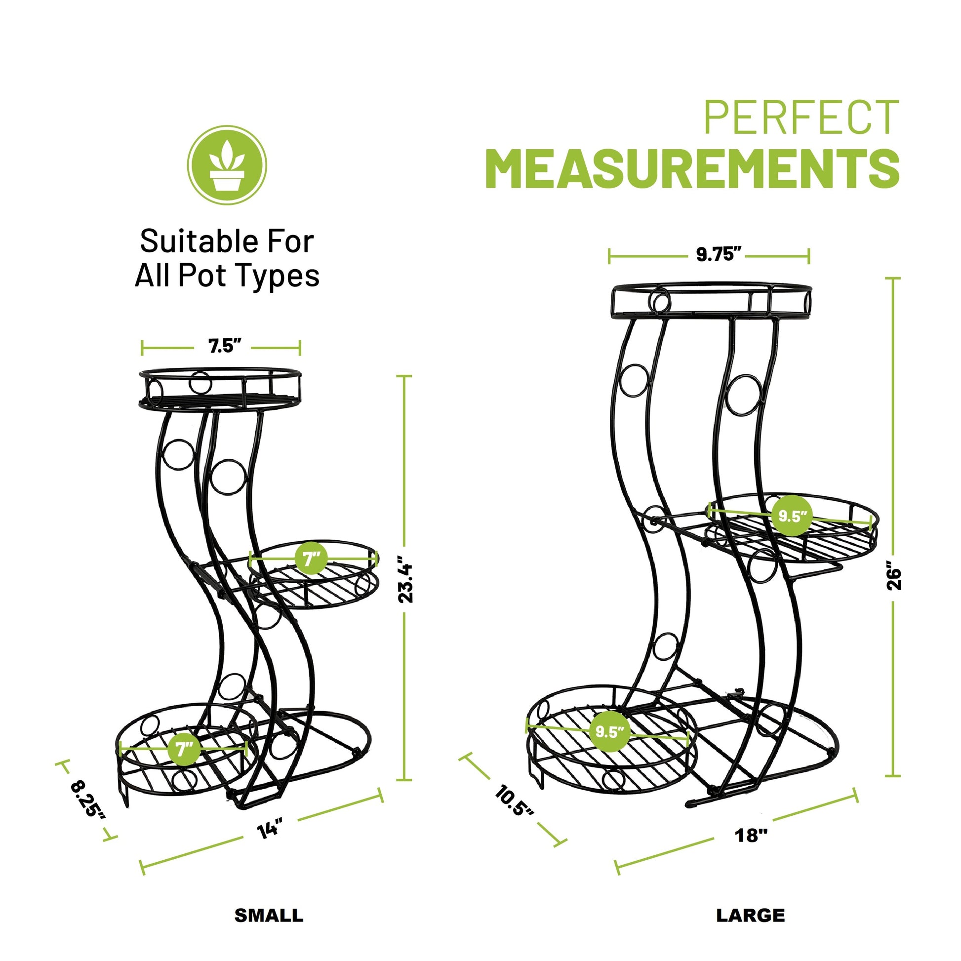 【GREAT SIZE 】3 metal plant shelves measure approximately 14” W X 23.4” H X 8.25” D. The planter trays are 7 inches in diameter. The first tray is 23.4 inches high, the second tray is 12.2 inches high and the third tray is 2.8 inches high (potted plants not included.)